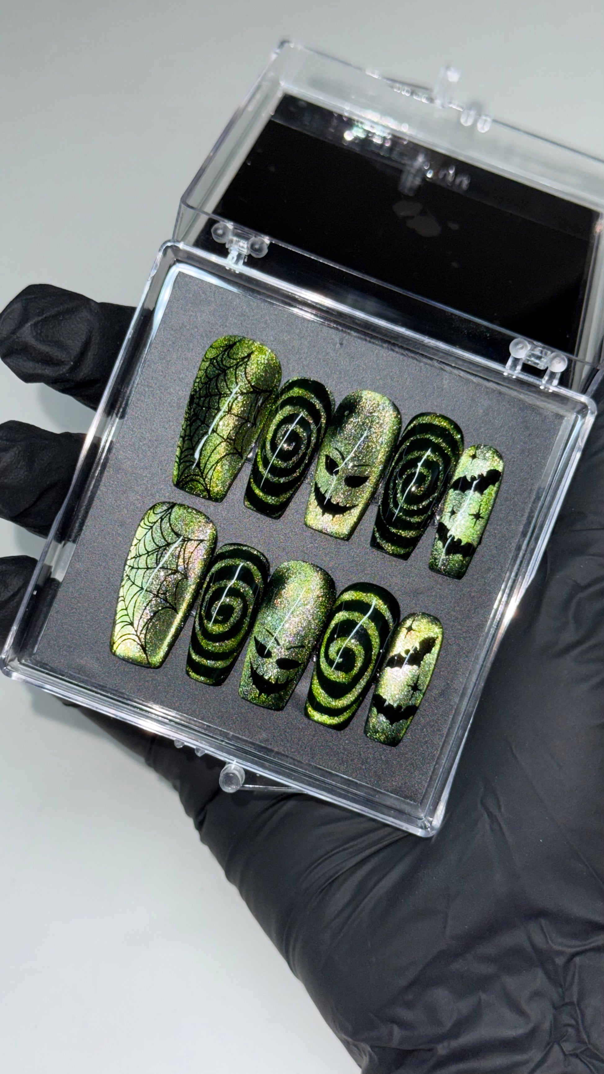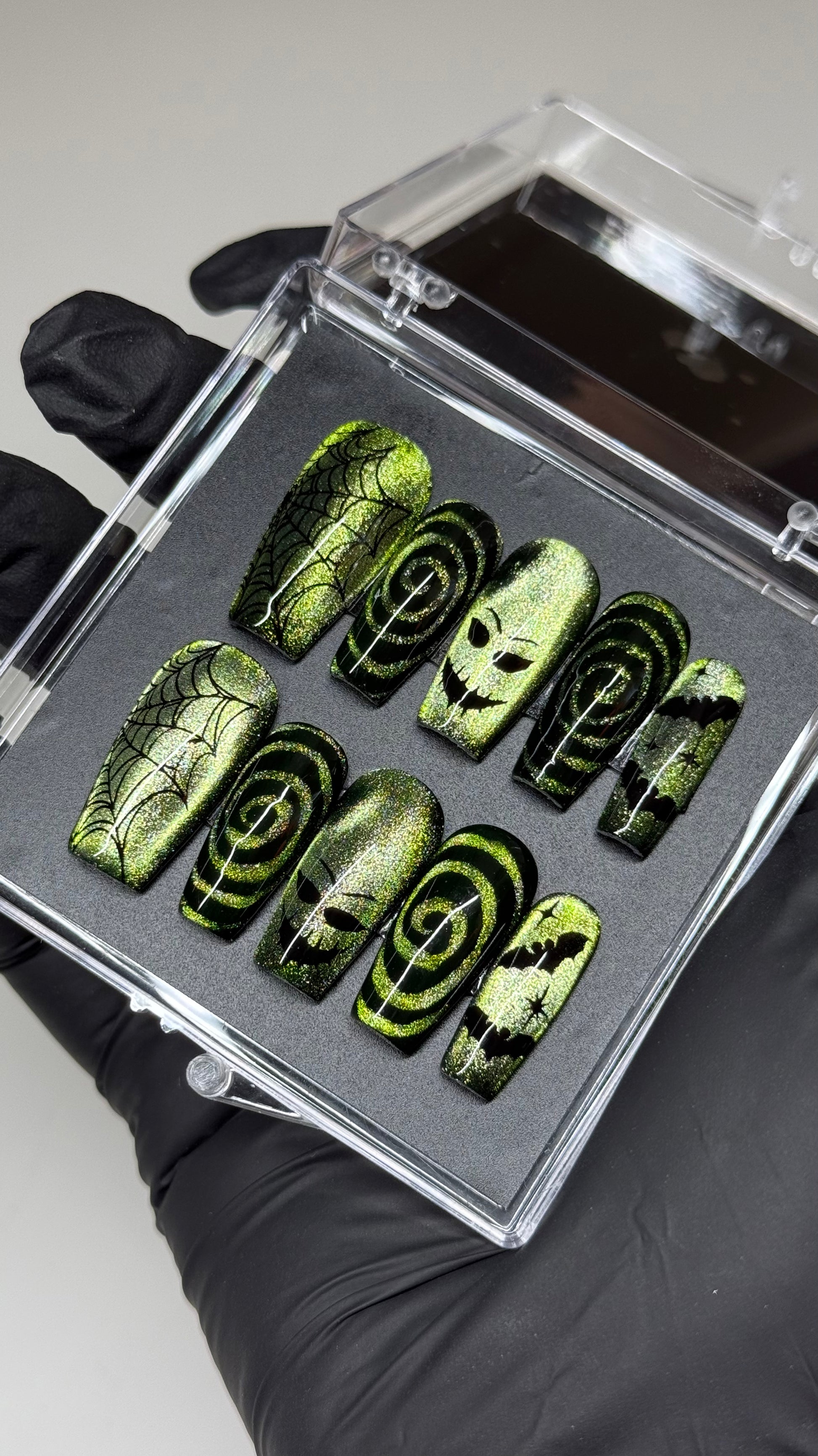 Super cute green oogie boogie cat eye set! Pictured on medium coffin.